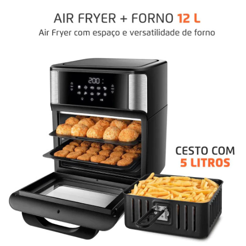 Além de fritar com até 80% menos óleo, esse modelo funciona como um forno elétrico multifuncional, permitindo preparar diferentes tipos de receitas.