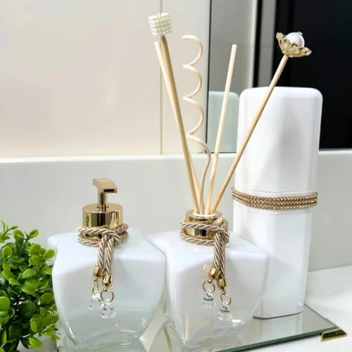 Um conjunto organizado ajuda você a manter a bancada do lavabo ou banheiro limpa, funcional e com visual harmônico. Kits desse tipo reúnem itens essenciais em uma só peça: dispenser para sabonete ou álcool em gel, aromatizador de ambiente com varetas para perfumar o espaço, suporte para escovas e uma bandeja decorativa que serve de base para todos os itens.